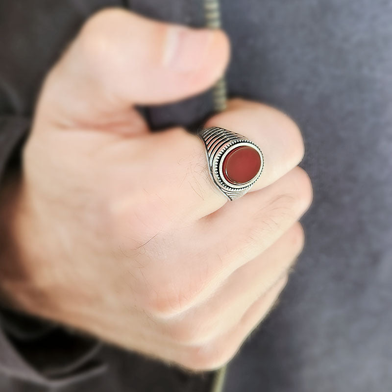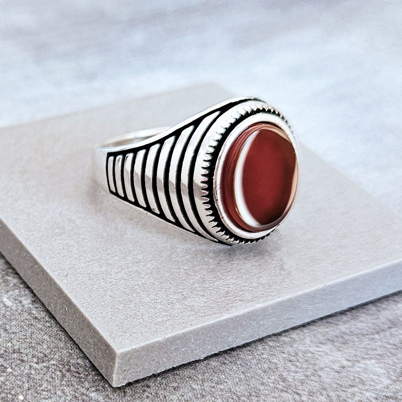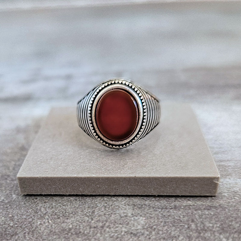 Crafted from high-quality sterling silver, this Elegant Red Carnelian Ring features a striking red carnelian stone known for its energizing and stabilizing properties. The beautiful textured design enhances its masculine appeal, making it an ideal choice for men seeking both style and meaning in their jewelry. The carnelian inlay adds a vibrant touch, symbolizing courage and confidence, perfect for everyday wear or special occasions.